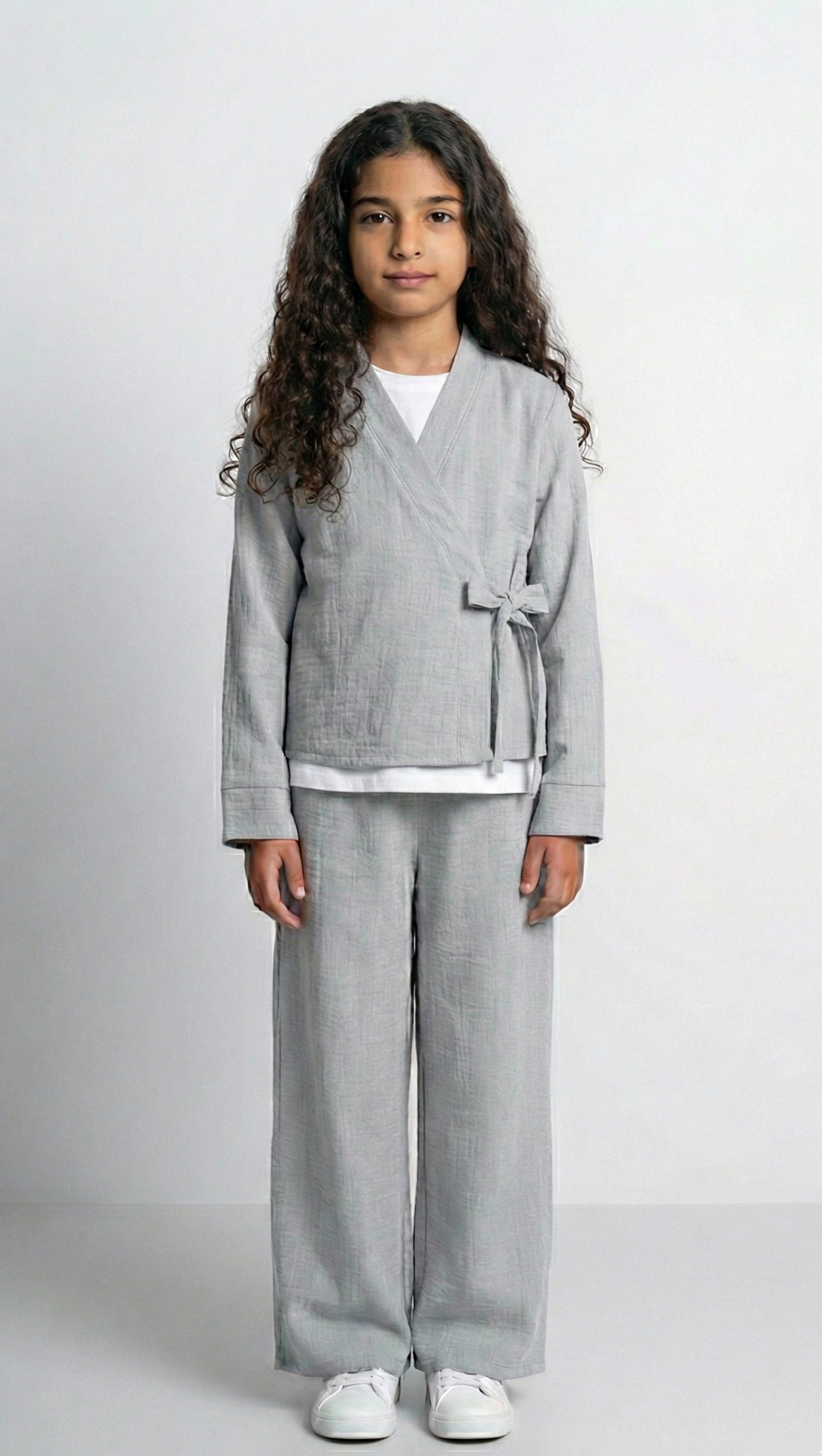 The Kids Wrap Set is a two-piece outfit designed for everyday wear with a refined look. The wrap-style top features a soft crossover design with a side tie, creating a comfortable and flattering fit. The matching wide-leg trousers offer ease of movement, making this set perfect for active days.
