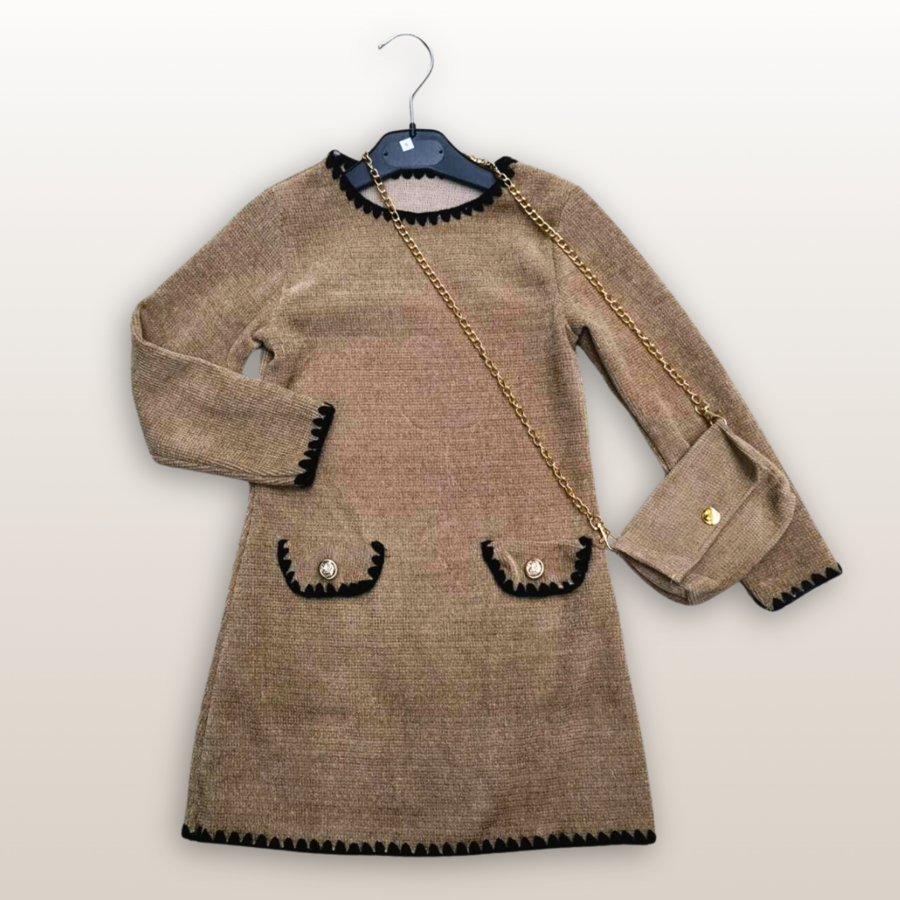 The Zahra Classic Dress brings elegance and luxury in one outfit. Made from soft tweed-style fabric with black velvet trim and gold button details. Comes with a matching bag featuring a gold chain strap — perfect for parties, Eid, family gatherings, and special occasions.